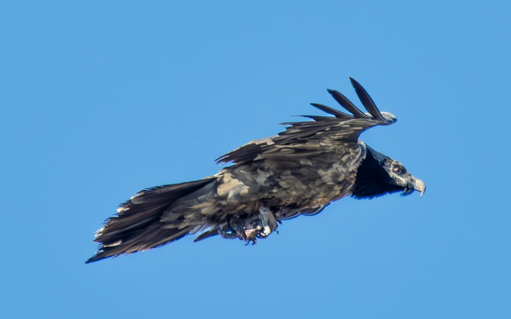 magnificent creatures in action. Just one lone bearded vulture, soaring high above the cliffs, clutching a bone in its claws. It flew up, up, up—then dropped the bone onto the rocks below with a loud crack! And then? It scooped it up again, flew back into the sky, and dropped it