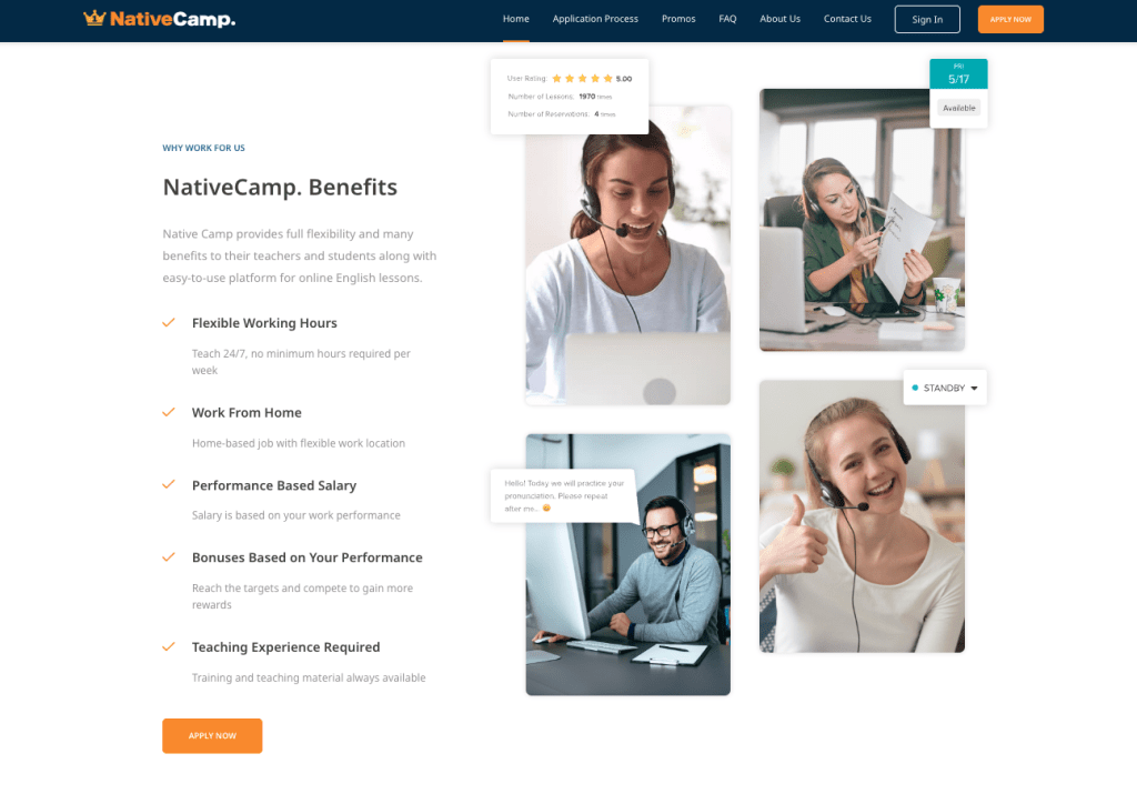 - 100% remote work – teach from anywhere with a reliable internet connection. Native Camp does prefer a simple, distraction-free background