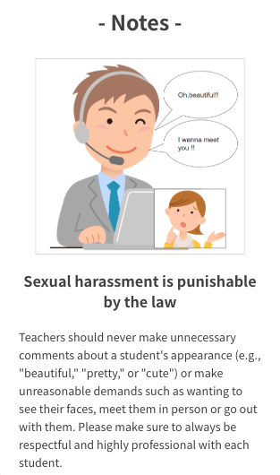 Being a Japanese company, they don’t state this outright, but there is a clear preference for no visible tattoos or facial piercings. I have several tattoos on my arm, so I either wear long sleeves when teaching or keep my arms out of frame as much as possible. It’s a cultural consideration – having tattoos won’t disqualify you, but it may affect how easily students book you