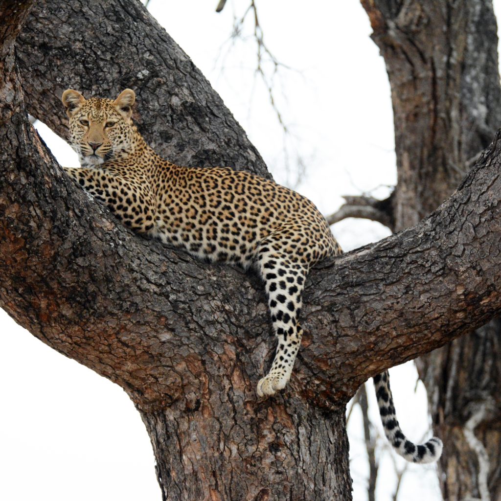 “Tree!” she managed, and sure enough, there it was—a leopard draped across a branch. Perfect sighting. It was still dusky, the sun not yet up, just 6:35 am. We parked, switched off the engine, and sat in amazement for a good 15–20 minutes before the first car arrived. In total, we watched that leopard for 45 magical minutes before a big game vehicle came along and it slipped away.