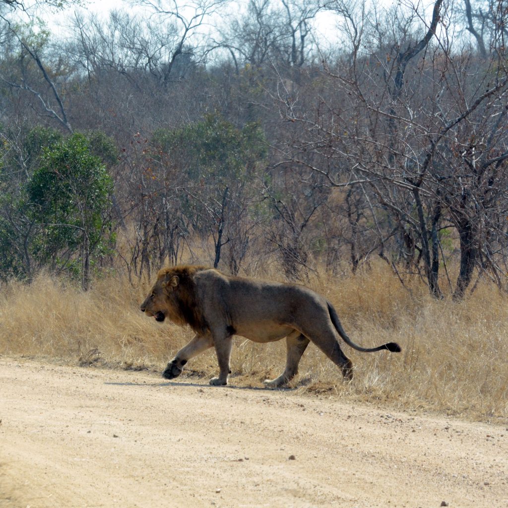Needing a loo and some refreshments, we let a car overtake us. Moments later, another vehicle came flying towards us, forcing me to pull over. As the dust settled and we pulled back onto the road, two magnificent male lions strolled out of the bush. Bam—4 out of 5 by 11:10 am! If only those two speeding cars had been going at the proper limit, they’d have seen them too. Just like that, the lions crossed and vanished.