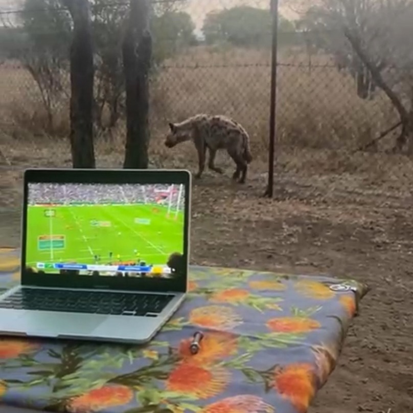 Back at Maroela, I managed to find just enough signal to hook the laptop up and stream the game. Fire going, rugby on the screen, a cold one in hand… bliss. But, as only in Africa, the evening came with an extra surprise: a group of hyenas arrived at the fence during the match, pacing back and forth, eyeing us as though they wanted to join the braai.